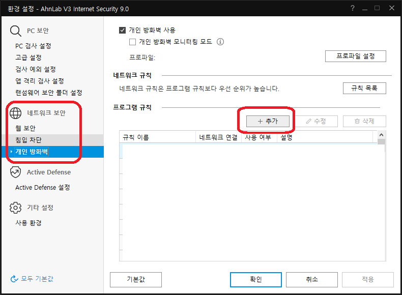 1. PC에 설치한 백신 프로그램의 환경 설정에 들어가, 네트워크 보안에서 '개인 방화벽' 을 찾습니다.