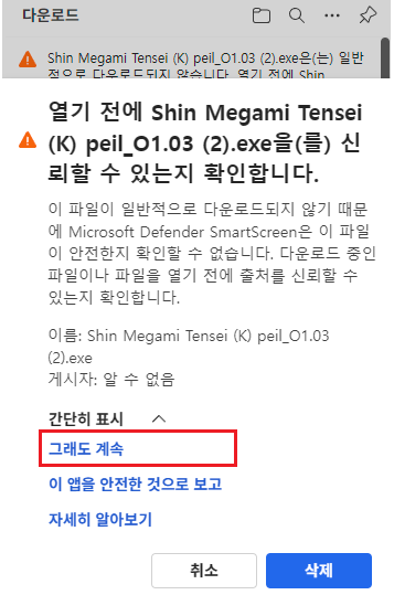Microsoft Edge는 우상단에 메시지가 발생할텐데, 추가 작업을 선택하고 유지를 누른 후, '더 보기' 에서 '그래도 계속' 을 선택하셔야 합니다.