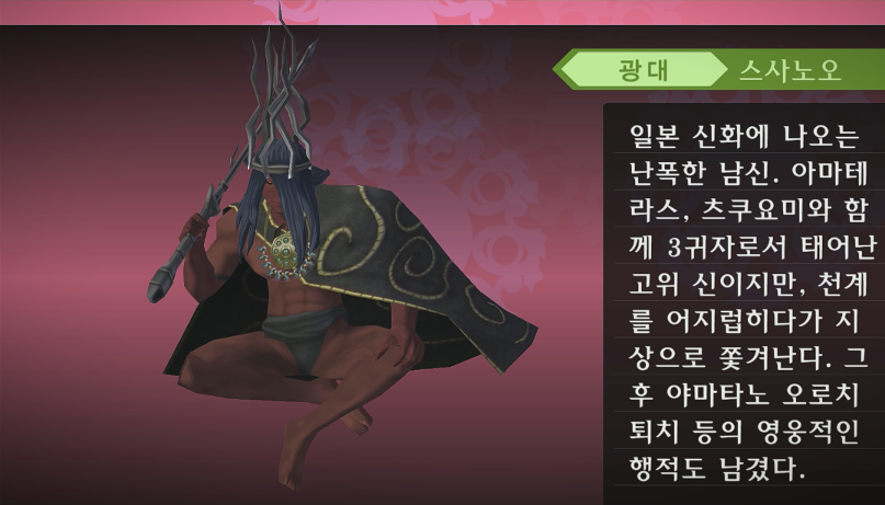 일본 신화에 나오는 아마테라스, 츠쿠요미의 동생으로, 난폭한 폭풍신.