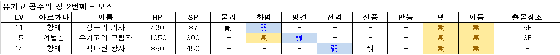 - 빛&어둠 무효 / 물리 내성 / 화염 약점