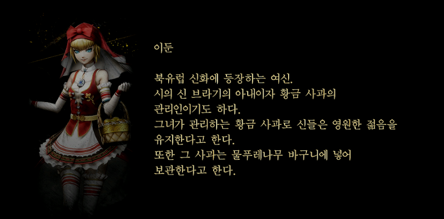 그녀가 관리하는 황금 사과로 신들은 영원한 젊음을 유지한다고 한다.