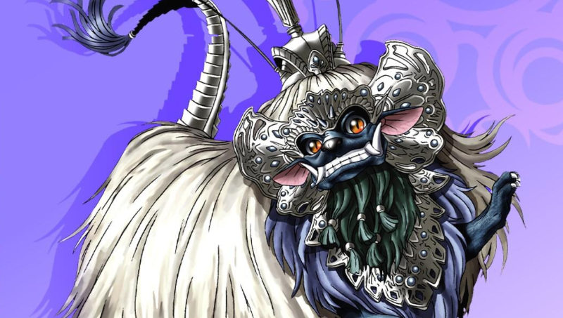 붉은 얼굴에 황금 갈기, 둥글고 튀어나온 눈알과 위턱에서 솟아오른 길고 굽은 송곳니가 특징이다.